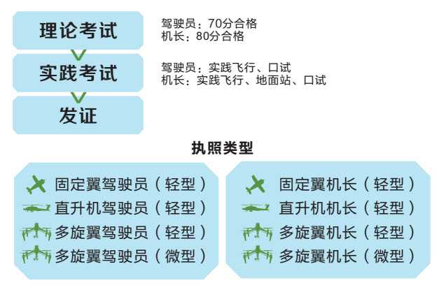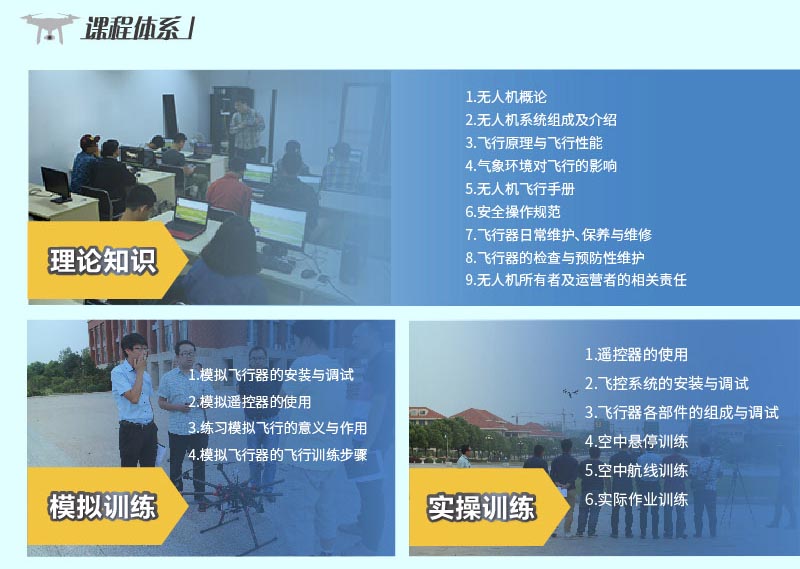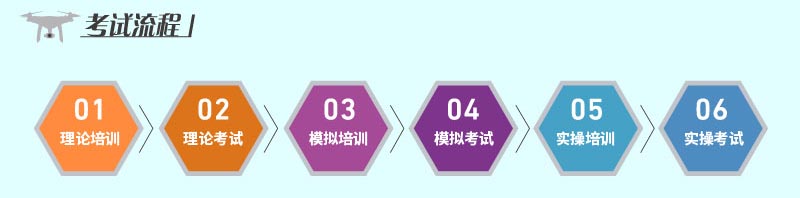 1、地面理论培训 理论课程由资深无人机教员授课,本中心自编内部理论辅导资料,紧扣考试大纲,针对性更强;考前全真模拟测评,还原考试现场,极大提高考试通过率。 (1)、理论知识 a、无人机相关法规 b、飞行原理与飞行性能 c、无人机驾驶员飞行手册 d、气象学知识 (2)、模拟训练 a、设备识别 b、设备检修 c、模拟器的安装与设置 f、模拟起飞训练 e、模拟转弯训练 f、模拟航线飞行训练 2、实践飞行训练 本院外场实践飞行训练由中国 AOPA (中国航空器拥有者及驾驶员协会)认证教员全程指导,专人一对一训练,目前有两处外场飞行训练基地:一处位于江宁,另一处位于迈皋桥。 a、无人机动力系统检查 b、无人机操控系统检查 c、无人机自驾系统检查 d、感受飞行带飞 e、航线飞行训练 3、考试规则 1) 机 长:理论80分合格,实践飞行手动飞水平八字,地面站自主飞行,口试。 2) 驾驶员:理论70分合格,实践飞行手动飞水平八字,口试。 3) 实践飞行: 直升机及多旋翼:手动起飞降落、对尾悬停、4位悬停、慢速自旋、4边航线、水平八字航线。 固定翼:手动起飞降落、4边航线、水平八字航线,模拟熄火降落。 七、考试流程