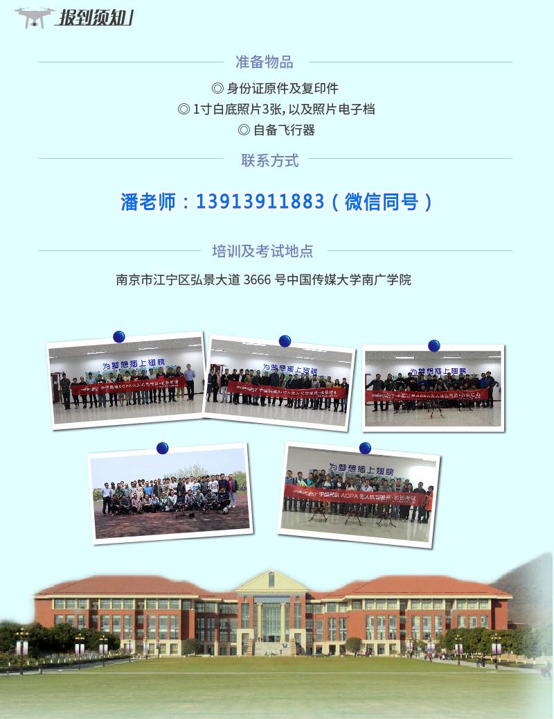 八、收费标准 驾驶员10000元,机长12000元。 建议提前报名缴费,无锡AOPA培训中心可以把教材快递给学员提前学习。 九、报到须知